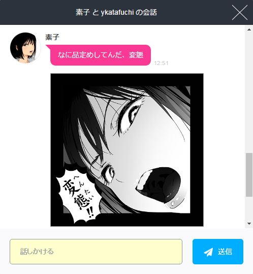 pixivなどで活躍するイラストレーター・mebaeさんの作品「罵倒少女」に登場するキャラクター・素子(もとこ)とチャットを楽しめるサービス。ユーザーが入力した言葉の意味を推測し、状況に応じて「ざまぁ!」「知らねぇよ」「悲しくなるくらい無様だな」などと罵倒するほか、イラストやボイスメッセージ(CV.井上麻理奈さん)を返す。サービス公開期間は8月15日正午まで。