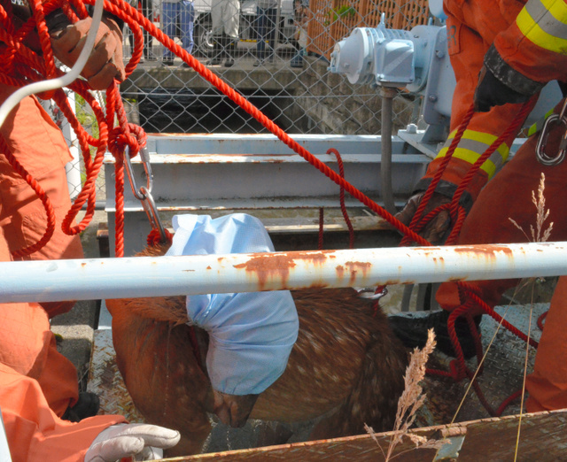 消防隊員らがロープを使って、用水路からシカを救出した