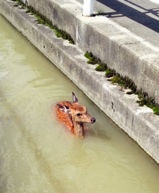 野生のシカが出没する場所ではないが、幅2メートルほどの用水路はこの日、水位が高く、流れも速かった。シカはみるみるうちに下流へ流された。