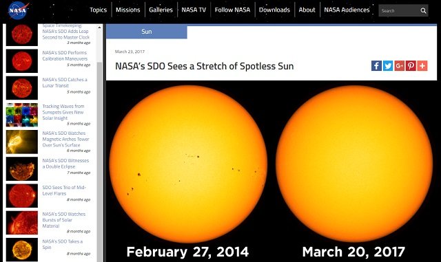 英紙「Daily Mail」(3月22日付)によると、NASAの太陽観測衛星「ソーラー・ダイナミクス・オブザーバトリー(SDO)」が太陽活動の停滞を観測。なんと、3月7日~22日の15日間連続で太陽黒点がゼロだったというのだ!