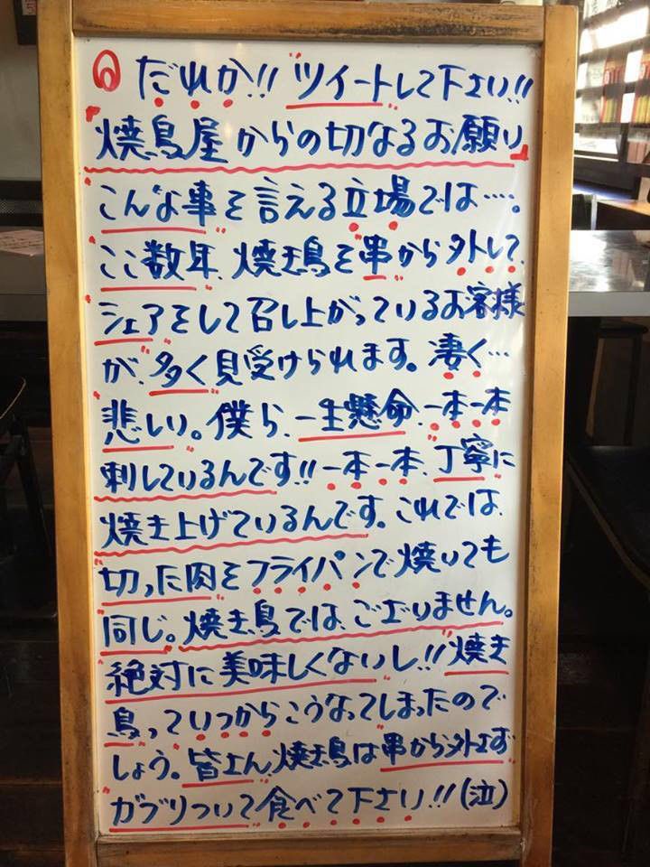 【賛否両論】焼き鳥屋のからの切なるお願い、反響を呼びネットで物議を醸すツイートして下さい。ということなので、是非とも拡散を願っている店主の思いを汲み取り掲載させていただこうと思います。こちらは現在ツイッターなどで反響を呼んでいる一枚の画像。ホワイトボードにびっしりと書かれた文字。通常「おすすめメニュー」などを記載する店の前の看板ですが、どうやらちょっと事情があるようです。