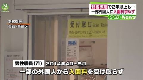 環境省によりますと、新宿御苑の管理事務所に勤める71歳の男性職員が、2014年4月から先月まで、一部の外国人から入園料を受け取っていませんでした。