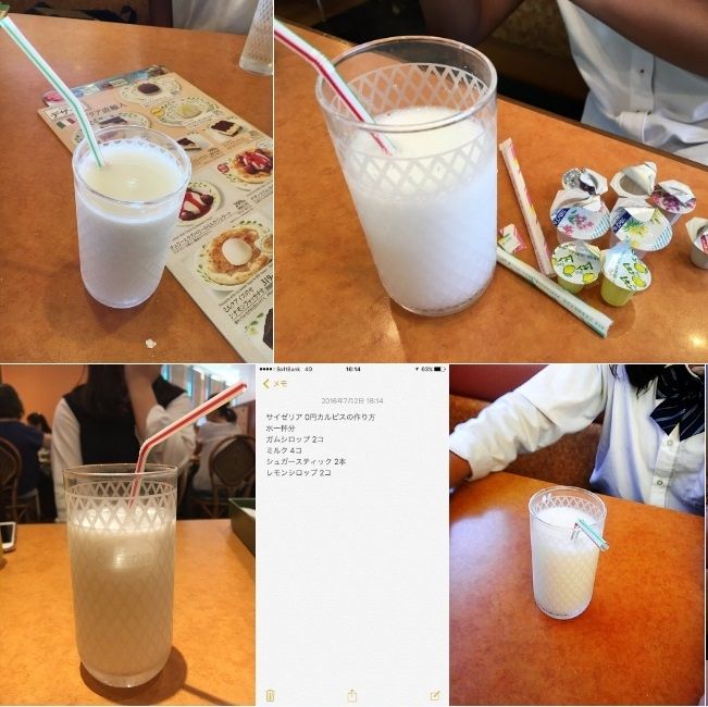 若者たちの間で流行っているというのが「0円カルピス」。どうやらドリンクバー付近に備えられている「ガムシロップ」「スティックシュガー」「レモン汁」「ミルク」などを使用して、カルピスに似た味の飲料を製作しているようだ。