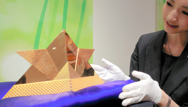 端午の節句を控え、名古屋市中区の貴金属店「GINZA TANAKA名古屋店」で、4千万円の純金製かぶとが展示販売されている。折り紙で作ったかぶとをモデルに、職人が竜の模様などを施した。