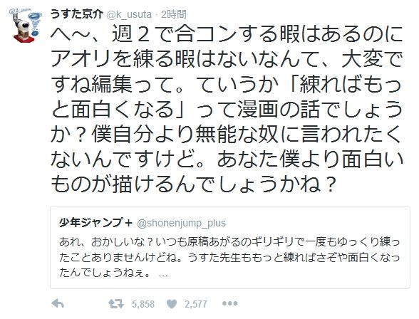【少年ジャンプ】 うすた京介さん、担当編集とTwitterで醜いバトル