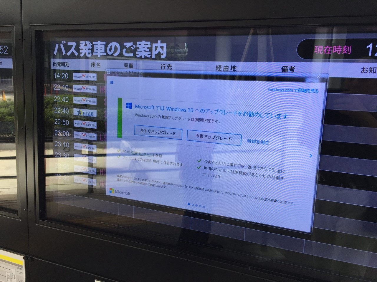 【画像】バス停の時刻表モニターがWindows10のアップグレード画面でふさがれる!について