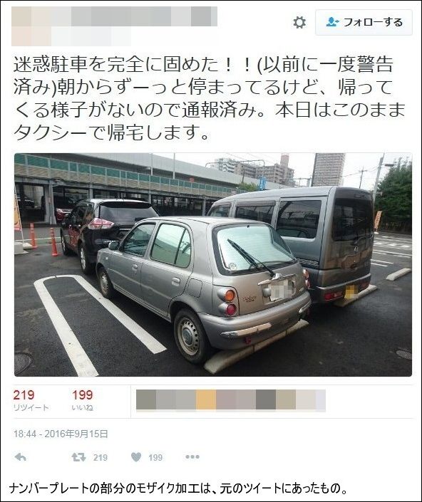 「迷惑駐車を完全に固めた!!(以前に一度警告済み)朝からずーっと停まってるけど、帰ってくる様子がないので通報済み。本日はこのままタクシーで帰宅します」。