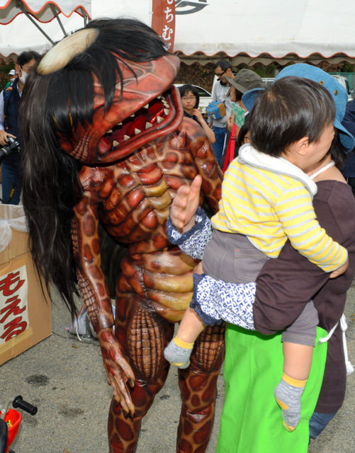 カッパのキャラクター「ガジロウ」がカレーの販売テントに立ってPR。その後、まつりの会場を歩き回ったが、「怖い」「嫌だ」と泣き出したり、逃げたりする子どもが相次いだ。
