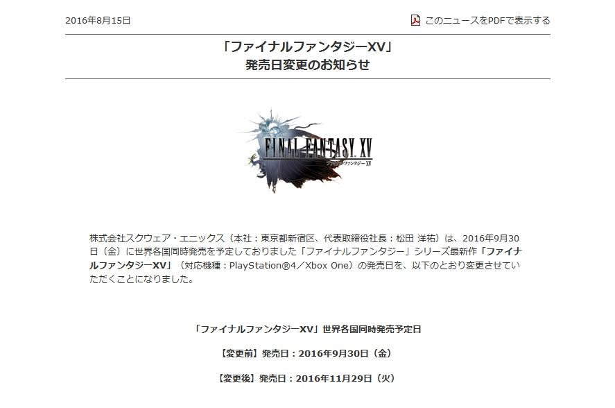 公式Twitterには「重要なおしらせ」として「『FINAL FANTASY XV』の発売日を2016年9月30日(金)から2016年11月29日(火)に変更させて頂きました」と告知されている。