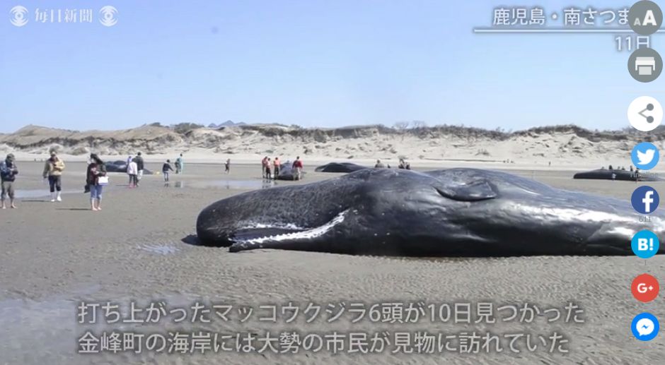 ※ソースに動画鹿児島県南さつま市金峰町で海岸に打ち上がったマッコウクジラ6頭が見つかってから一夜明けた11日、現場には大勢の市民が見物に訪れた。