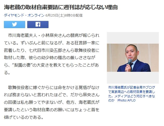 海老蔵氏の気持ちは理解しているが、しかし、そこで“はい”と引き下がったら、雑誌メディアは存在意義を失う。と同時に、海老蔵氏はその自粛要請がご自身とメディアとの決別を意味していることを理解しているだろうか?