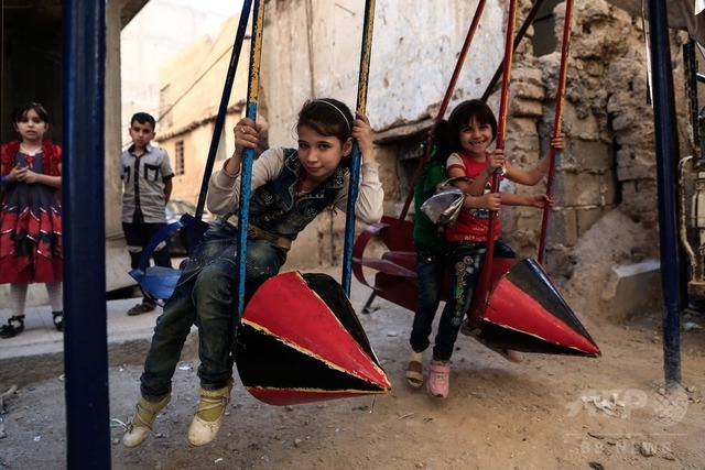 【9月18日 AFP】世界中の子どもたち同様、内戦が続くシリアの子どもたちも遊び場が大好きだが、首都ダマスカス(Damascus)の 近郊の反体制派が掌握する東グータ(Eastern Ghouta)地区にある遊び場のブランコは使用済みのロケット弾でつくられており、 ジャングルジムは地下に隠されている。