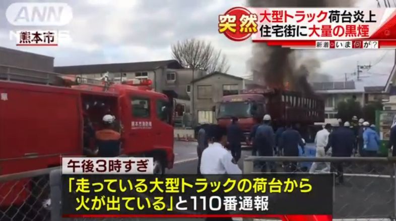 警察と消防によりますと、23日午後3時すぎ、熊本市で「大型トラックの荷台から火が出ている」と110番通報がありました。その後、火が出ていることに気付いた運転手が自ら消防に通報したということです。荷台には油が染み込んだ紙やごみなどが積まれていました。トラックはしばらくの間、火が出た状態のまま住宅街を走っていて、消火活動が行われた現場付近には黒い煙が立ち込めました。