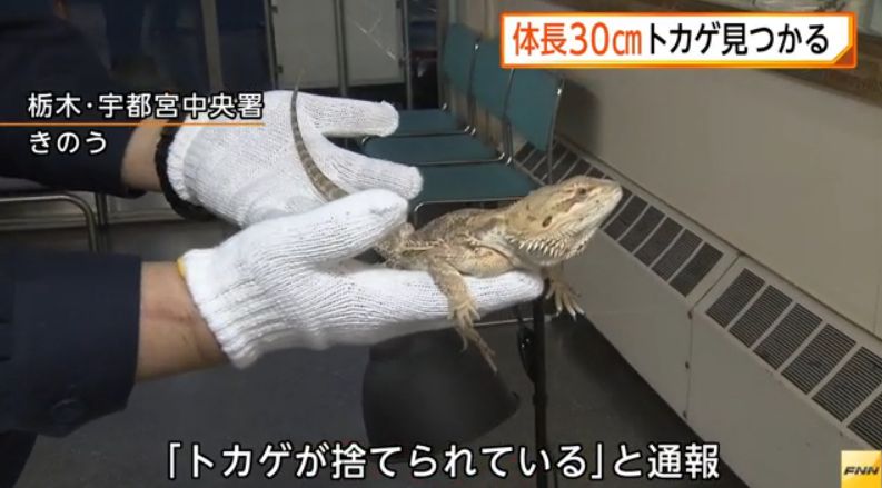 栃木・宇都宮市で、体長およそ30cmのトカゲが見つかった。18日午後2時ごろ、宇都宮市長岡町で、「トカゲが捨てられている」と警察に通報があり、道路脇の草むらに、体長およそ30cmの「フトアゴヒゲトカゲ」とみられるトカゲが飼育道具と一緒にケースに入れられているのが見つかった。