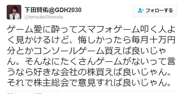 ゲーム愛に酔ってスマフォゲーム叩く人よく見かけるけど、悔しかったら毎月十万円分とかコンソールゲーム買えば良いじゃん。そんなにたくさんゲームがないって言うなら好きな会社の株買えば良いじゃん。それで株主総会で意見すれば良いじゃん。