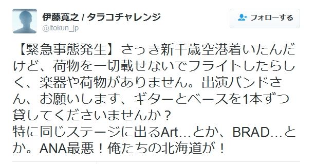 【緊急事態発生】さっき新千歳空港着いたんだけど、荷物を一切載せないでフライトしたらしく、楽器や荷物がありません。出演バンドさん、お願いします、ギターとベースを1本ずつ貸してくださいませんか?