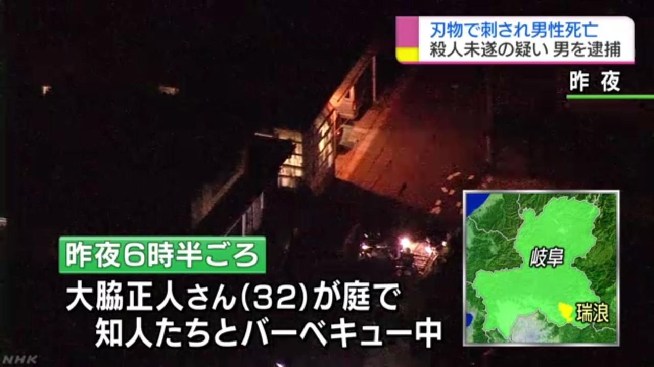 7日午後6時半ごろ、瑞浪市の住宅の庭で、この家に住む会社員の大脇正人さん(32)が知人たちとバーベキューをしていたところ、刃物を持った男が現れ、自宅前の路上で腹部を刺されました。大脇さんは病院に運ばれましたが、およそ1時間後に死亡しました。