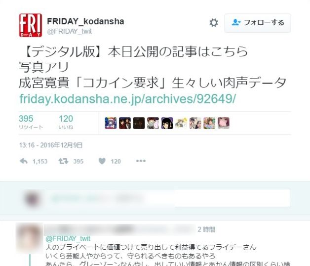 成宮の引退でフライデーに批判殺到 「責任とれよ」「みんなで力合わせてこの会社潰そうよ」
