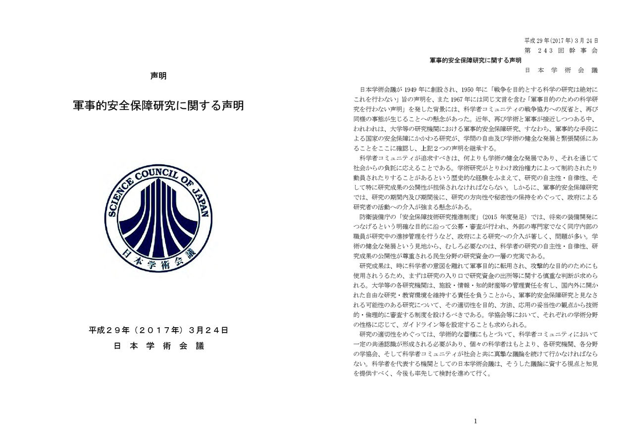 声明は軍事研究を禁じた過去の声明を「継承する」と明記している。防衛省が防衛と民生双方に応用可能な技術の研究を推進する目的で平成27年度に創設した「安全保障技術研究推進制度」に関しても「政府による研究への介入が著しく、問題が多い」とした。学術会議内には総会で、声明に対する賛否を問うべきだとして採決を求める声もあったが、3月24日の幹事会で決定し、総会では報告にとどめた。