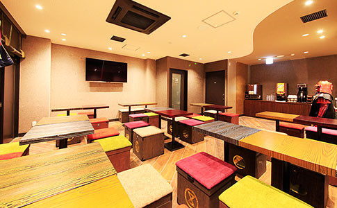 富士山の絵があり、共用の畳の部屋で座布団に座り、駄菓子(無料)が味わえるなど、日本のカルチャーが