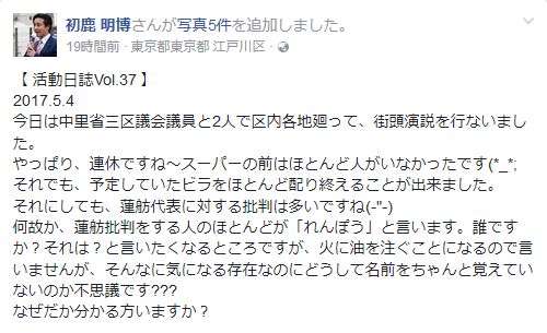 初鹿議員は5月4日に街頭演説を行った際の報告を当日夜、Facebookに掲載しましたが、この話はその中で語られていました。初鹿議員が「それにしても、蓮舫代表に対する批判は多いですね」と評判の悪さに改めて言及するほどだったようですが、そうした人々の殆どが蓮舫代表を「れんぽう」と呼んでいたといいます。