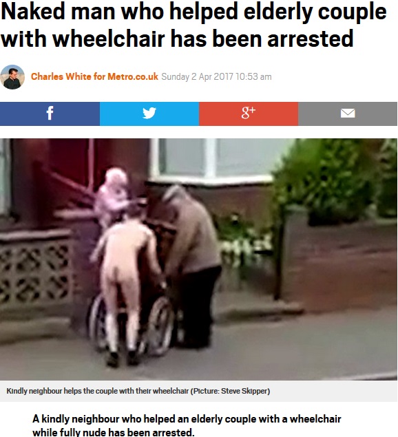 親切心で車椅子の高齢者を手助けするも、全裸ゆえ逮捕された男性(出典:http://metro.co.uk)