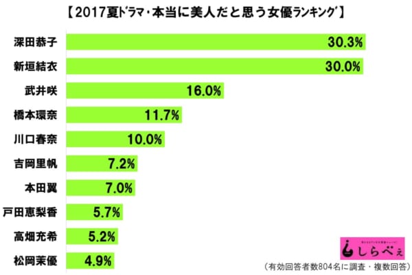 7月期のテレビドラマが続々スタート。春のドラマでは、ドロドロのW不倫を描いた『あなたのことはそれほど』(TBS系)などが話題になったしらべぇ編集部では、全国20~60代の男女804名を対象に、夏ドラマ出演女優の中から、本当に美人だと思う女優を複数回答で選んでもらった。