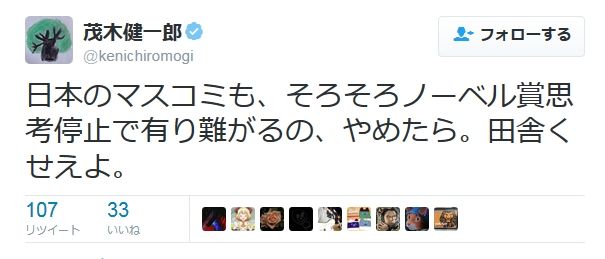 茂木健一郎「そろそろノーベル賞思考停止で有り難がるの、やめたら。田舎くせえよ。」