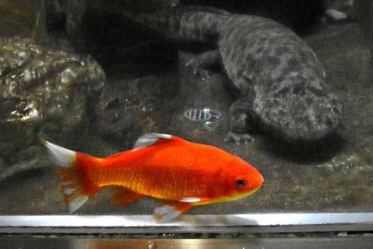 飼育担当者の学芸員、吉川貴臣さん(42)は「オオサンショウウオの動きを見切っていて、食べられそうになるとぱっと逃げる。餌の金魚がここまで生き残るのは珍しい。長い付き合いなので、愛着が湧いてしまって…」。