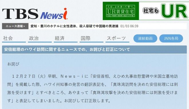 TBSは3日までに、同局のニュースサイトで安倍首相のハワイ訪問に関する誤表記を謝罪した。