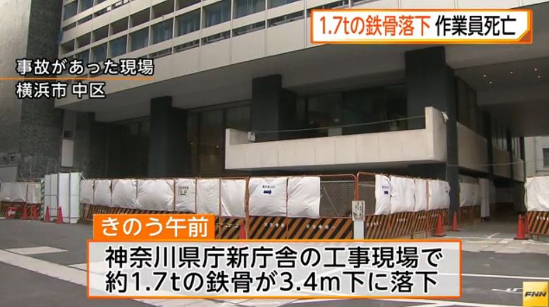 神奈川県庁新庁舎の工事現場で、およそ1.7トンの鉄骨が落下し、下敷きとなった男性作業員が死亡した。10日午前、横浜市中区の神奈川県庁新庁舎の工事現場で、