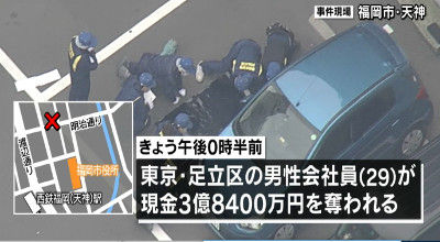 29歳男性会社員、路上で現金3億8000万円奪われる みずほ銀行福岡支店前について