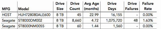 「8TB」モデルは、HGSTの「HUH728080ALE600」とSeagateの「ST8000NM0055」が故障率0%ですが、Seagateの「ST8000DM002」は故障率が1.63%。
