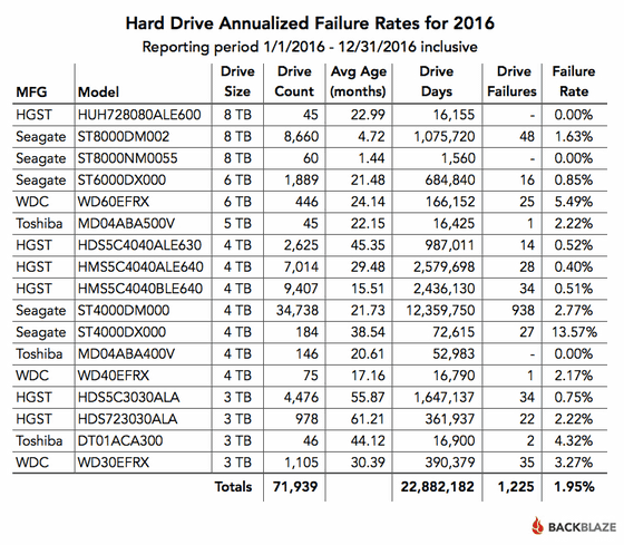 自社でクラウドストレージデータセンターで運用しているBackblazeが7万2100台のHDDを調査し、2016年におけるHDD故障率のメーカー・モデル別統計データを公開しました。2016 Hard Drive Reliabilty Benchmark Stats